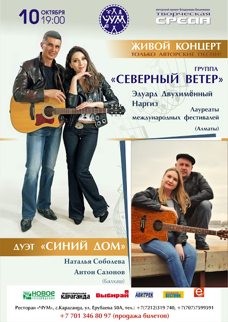 10 октября в ресторане "ЧУМ" выступят два самобытных коллектива: группа "Северный ветер" (Алма-ата) и дуэт "Синий дом" (Балхаш). Эти музыканты исполняют свои авторские произведения. Оба коллектива уже выступали в "Творческой среде" и произвели яркое впечатление на зрителей.